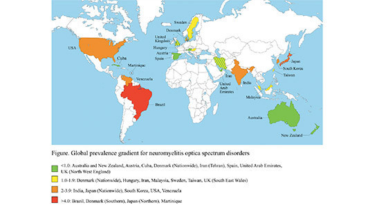 Neuromielite Óptica (NMO) é uma doença inflamatória de natureza autoimmune que predominantemente causa neurite óptica (inflamação dos nervos ópticos ) e mielite (inflamação da medula espinal). A doença é recorrente, com ataques repetitivos caracterizados principalmente por diminuição da visão, alterações da sensibilidade e diminuição da força nos membros. A NMO tem alta prevalência no Brasil quando comparada com a de outros paises (Figura ao lado).
